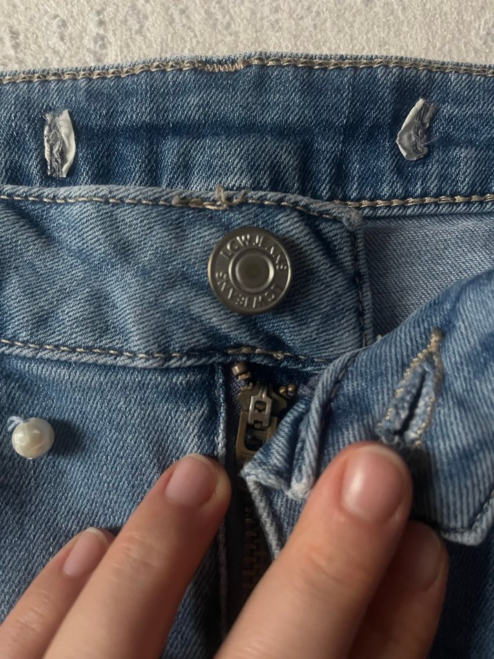 Düğmeli, mavi renkli, nakış detaylı ve parlak görünümlü, günlük kullanım için uygun, fitted kesim kadın denim pantolon. ✨