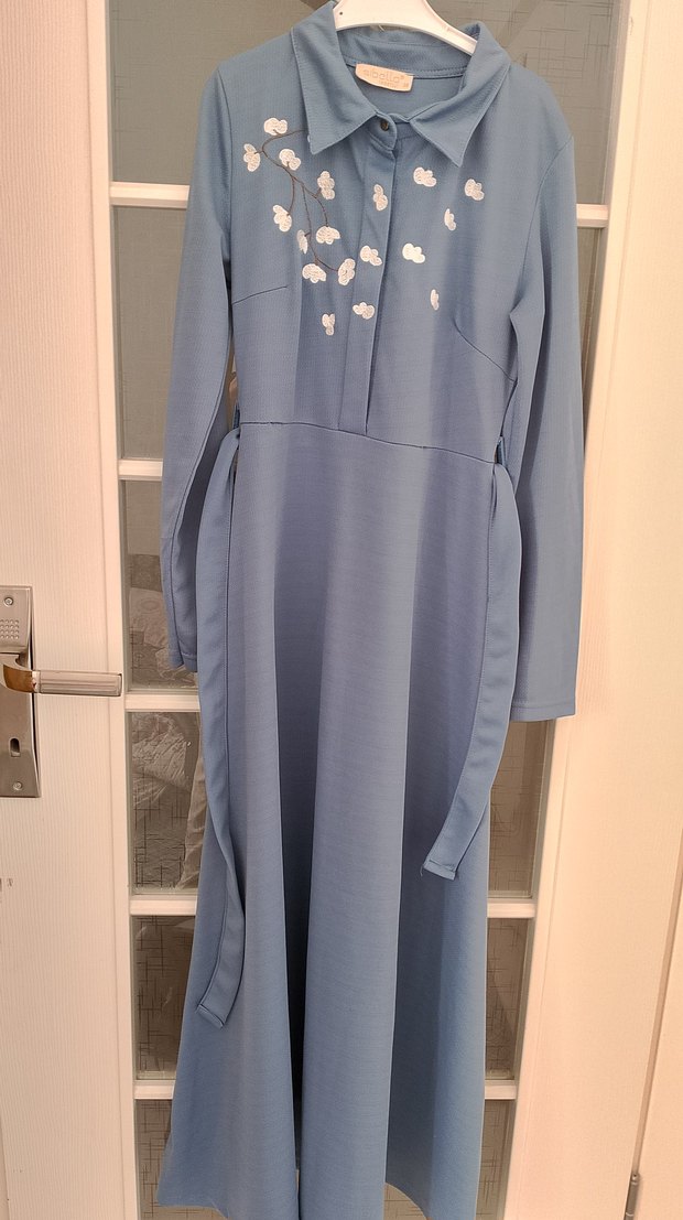 Düğmeli Mavi Nakışlı Uzun Kadın Elbise