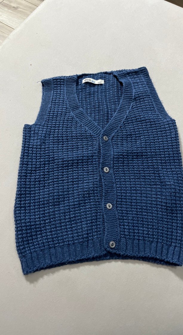 Düğmeli, mavi renkli, örgü çocuk süveter.