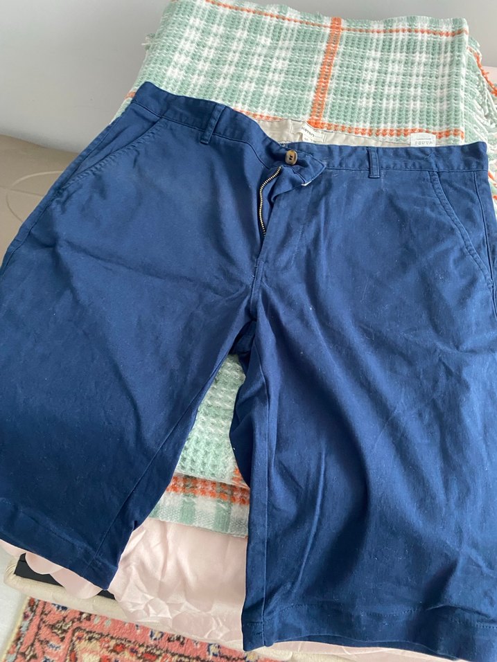 Düğmeli, pamuklu, mavi renkli, bol kesim bermuda şort. Sokak stiline uygun, günlük kullanıma ideal, parlak görünümlü midi boy şort.