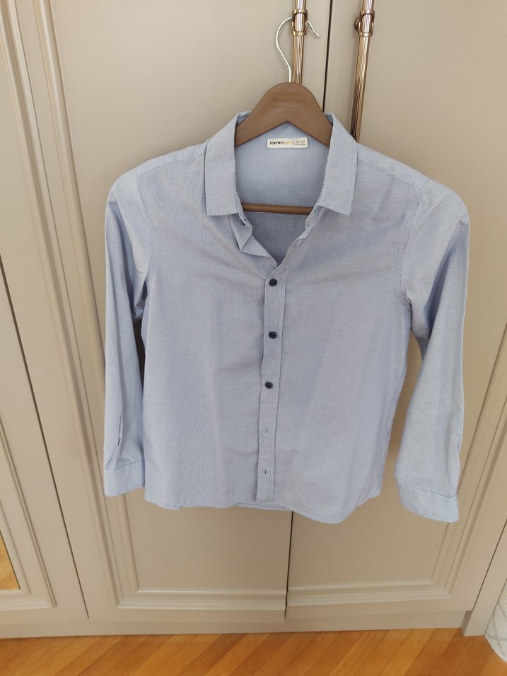 Düğmeli, yakalı ve uzun kollu erkek çocuk gömleği. Yumuşak pamuktan üretilmiş, ince çizgili mavi renkte ve rahat kesimlidir. kolunda ufak bir leke var fotoğrafda görülüyor