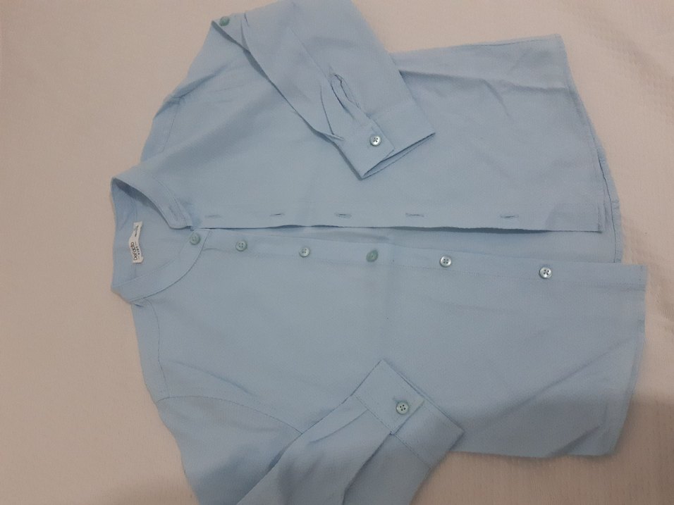 Düğmeli, yakalı ve uzun kollu bu erkek gömleği, pastel mavi renkte yumuşak pamuk kumaştan üretilmiştir. Düz ve rahat kesimlidir, kol manşetleri düğmelidir.