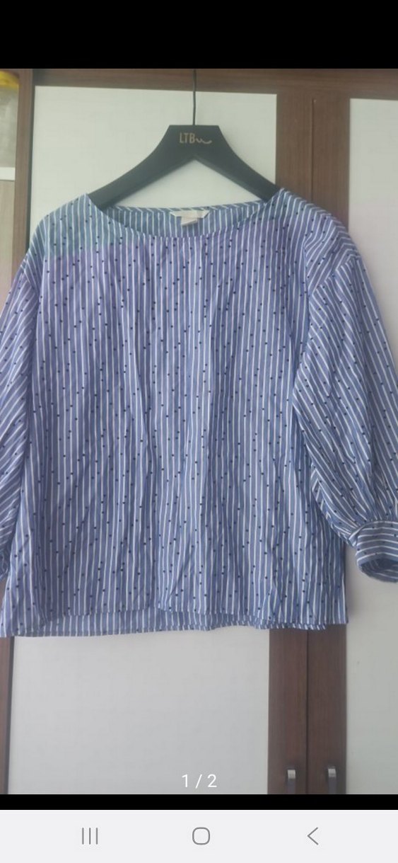 Pamuklu, düğmeli detaylı, salaş kesim mavi kadın bluz. Uzun kollu, kayık yaka ve ince çizgili desene sahip, günlük kullanıma uygun.