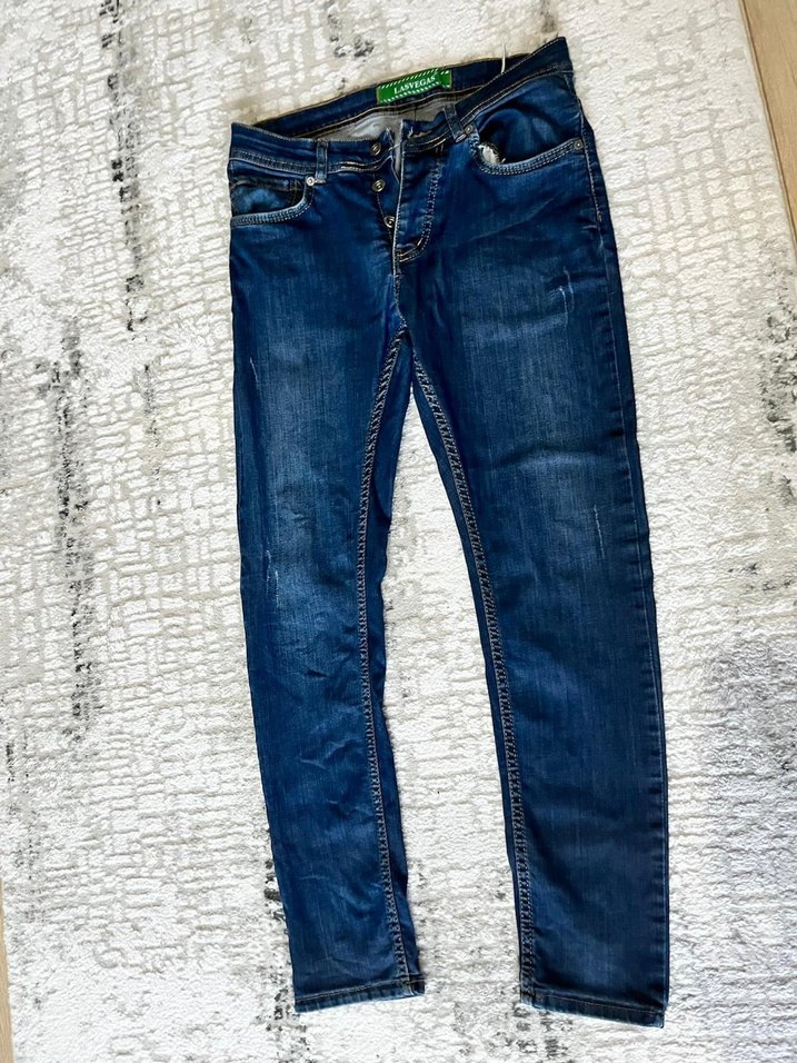 Düğmeli, normal boy, regular kesim mavi denim pantolon. Günlük rahat sokak stili için parlak görünümlü.