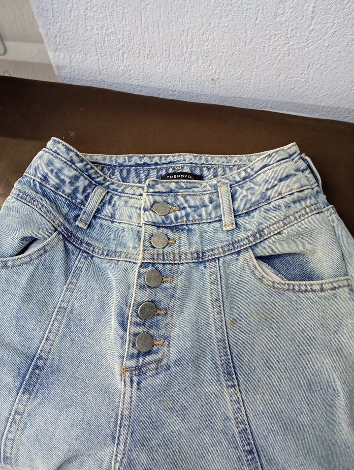 Düğmeli, rahat kesim mavi denim jean. Normali boy ve gündelik sokak stiliyle uyumlu.