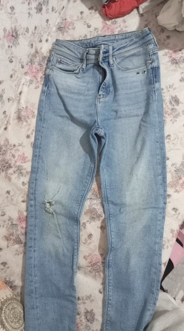 Düğmeli, rahat kesim mavi denim kadın kot pantolon. Günlük kullanıma uygun, normcore tarzda midi boyda.
