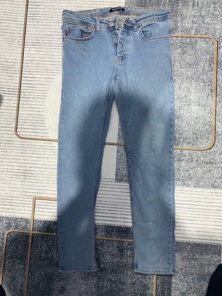 Düğmeli kapamalı, regular fit midi uzunlukta mavi kot pantolon. Günlük kullanıma uygun
