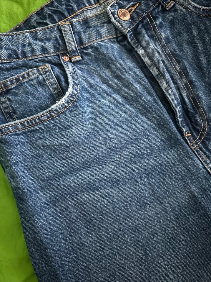 Düğmeli, parlak mavi renkte, salaş kesim kadın denim pantolon. Günlük kullanım için rahat ve sokak tarzına uygun.