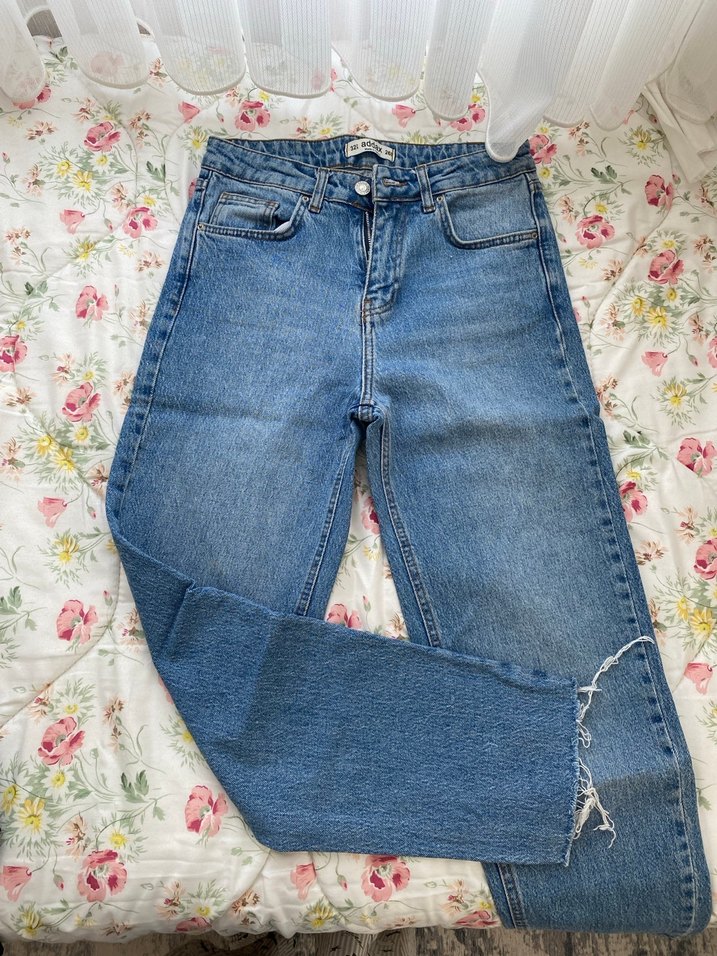Düğmeli, normal boyda, salaş kesim mavi kot pantolon. Günlük kullanım için rahat, bağlama desenli tasarım.