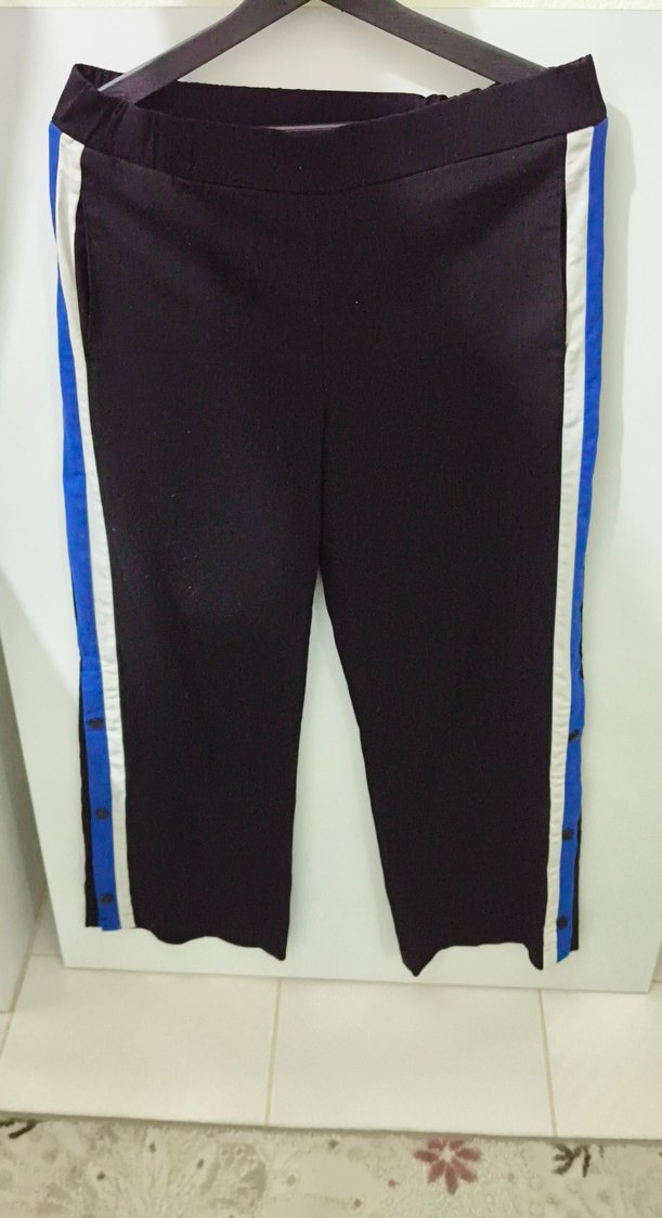 Düğmeli, lacivert kumaş pantolon, yanlarda mavi ve beyaz şeritler bulunur. Regular fit ve midi boydadır, spor tarzı için uygundur. ♀️