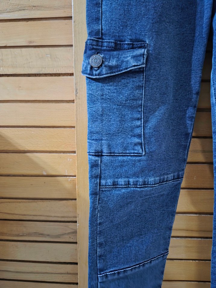 Düğmeli cepleri ve normal kalıbıyla mavi denim kadın kot pantolon, günlük sokak stili için uygundur. Midi uzunlukta ve desensizdir.