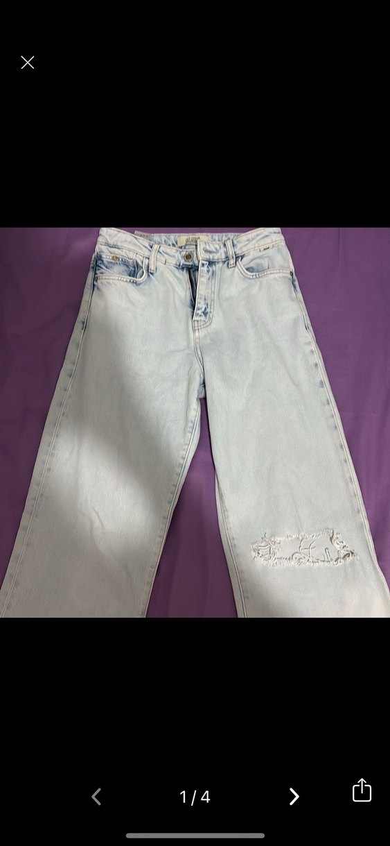 Düğmeli, pastel mavi tie-dye desenli, bol kesim kadın jean pantolon. Denim kumaştan, midi boyda, rahat günlük sokak stili için uygundur.