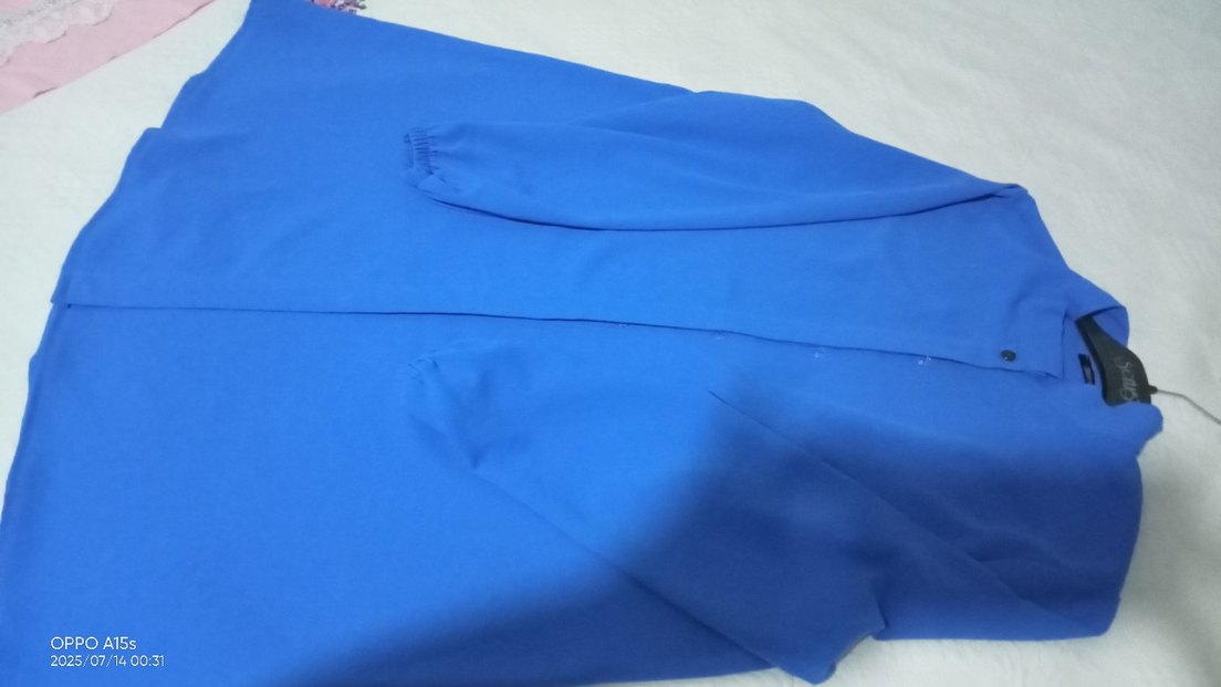 Parlak mavi renkte, dik yakalı ve düğmeli ön kısmı ola Uzun kollu tunik gömlek iki kol arası 57 cm boyu 88,-90 cn