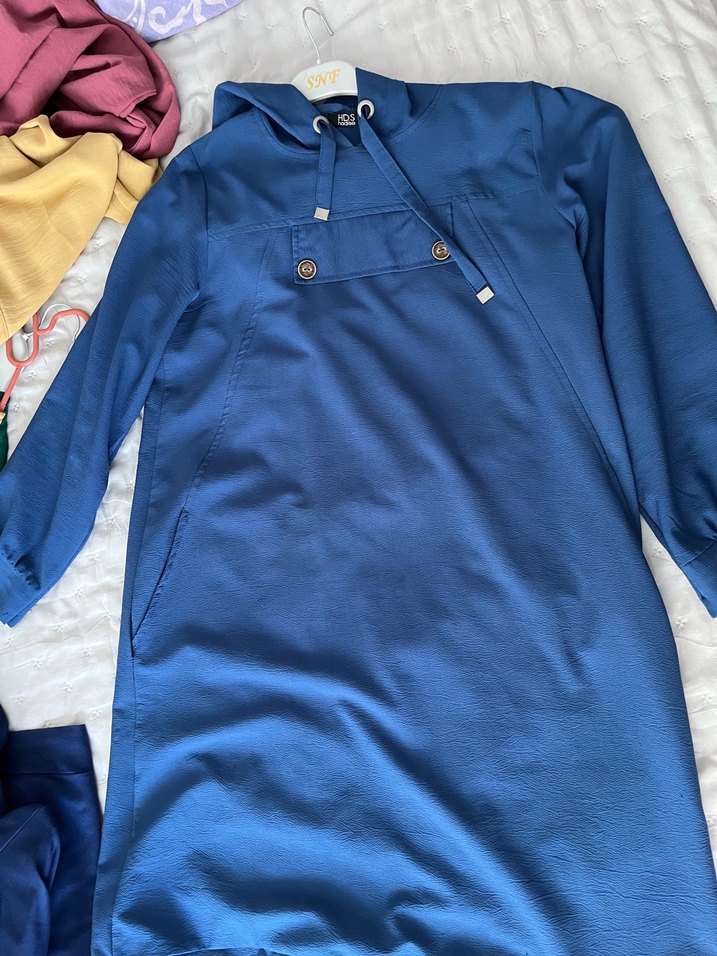 Düğmeli, uzun kollu ve yüksek yakalı koyu mavi tunik. Yumuşak ve sıcak kumaştan, rahat ve bol kesimlidir. Günlük kullanıma uygundur.