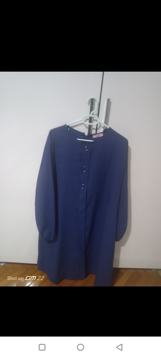 Düğmeli ön kısmı, uzun kollu ve yuvarlak yaka detaylı mavi tunik. Rahat kesimi ve sentetik dokusu ile minimalist tarz için uygun. boy 107 koltuk altından ge 56 cm