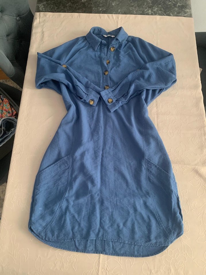 Mavi renkli, keten kumaştan yapılmış düğmeli tunik. Yaka düğmeli, kısa kollu, bol kesim ve midi boyda, günlük kullanıma uygun. 50x50(ön +arka) 100cm beli