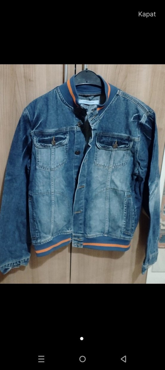 Düğmeli, uzun kollu, çıtçıtlı mavi denim ceket. Normal kesim, parlak renk ve cepli, günlük kullanım için uygundur.