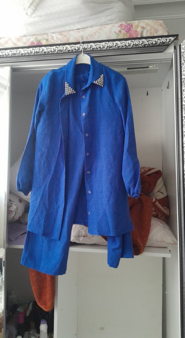 Parlak mavi keten kumaştan, düğmeli uzun hamile kabanı. Notlu yaka ve uzun kollu, günlük rahat sokak stili için uygun, normal kesim.
