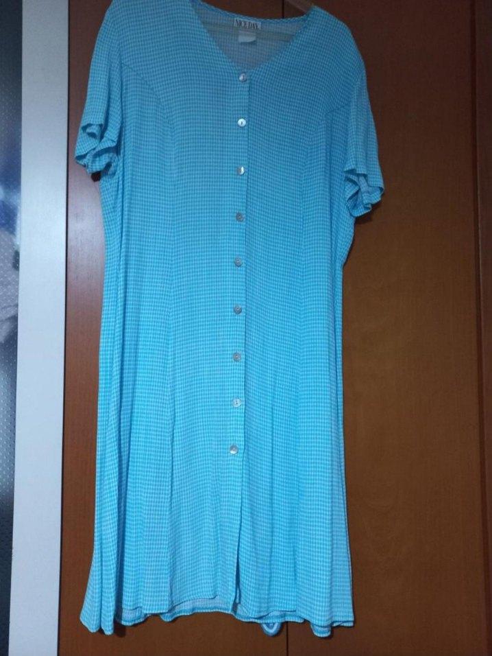 Düğmeli, kısa kollu, V yakalı, bol kesim mavi uzun elbise. Yumuşak sentetik kumaştan, vintage tarzda, gündelik kullanıma uygun. 40 42 44 beden kullanabilir