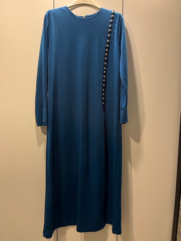 Yeşil, nakışlı, uzun bohem elbise; bol kesim ve drapeli tasarım, uzun kollu ve kayık yaka. Yumuşak keten kumaştan yapılmıştır hiç giyilmedi.