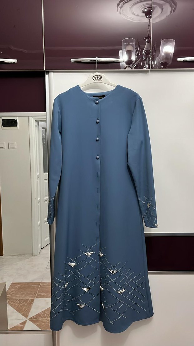 Düğmeli önden kapanışlı, uzun kollu mavi pantolonlu takım. Kollar ve etek kısmında işleme detayları bulunur.Markası moda selvim.