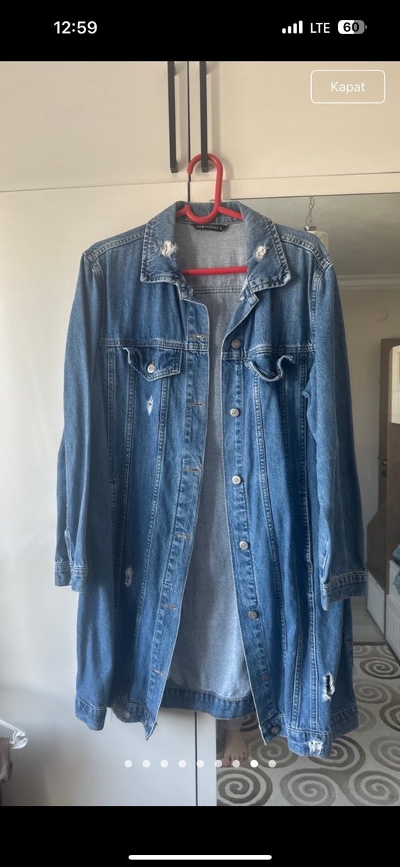 Düğmeli, uzun kollu, mavi kot ceket. Salaş kesim ve çıtçıtlı, notlu yaka detayına sahip, günlük kullanıma uygun. Pazarlıklıdır