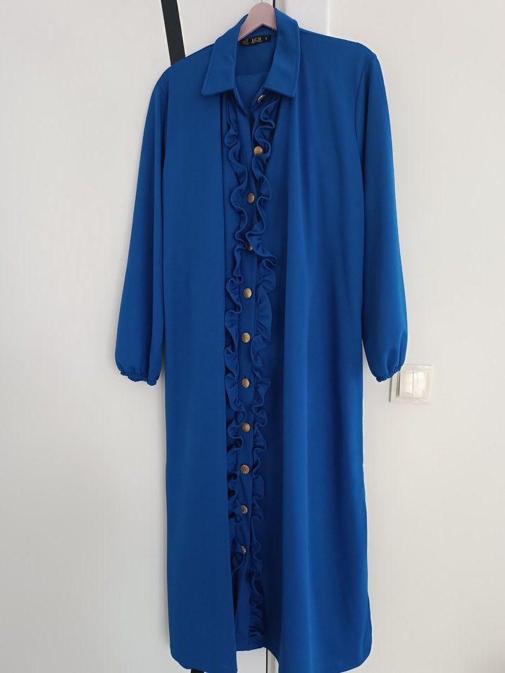 Mavi uzun elbise, düğmeli ve yakalıdır. Uzun kollu, bol kesimdir tunik pantolon hiç giymedim zayıfladım satıyorum
