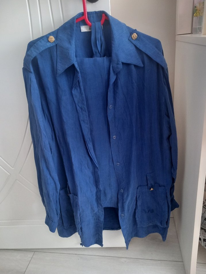 Düğmeli, parlak mavi keten kumaştan, uzun ve bol kesim ceketi. Notlu yakalı, uzun kollu ve cepli, ofis kullanımı için uygun.