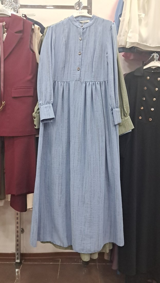 Mavi keten uzun elbise, düğmeli ve bol kesimdir. Uzun kollu, kayık yaka ve günlük rahat bohem tarzındadır. 38-40-42-44-46-48