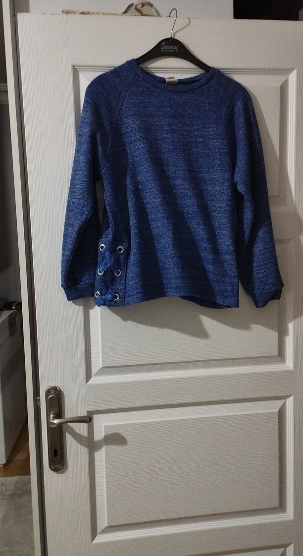 Mavi , düğmeli yan detaylı, uzun kollu kadın kazak. Günlük rahat kullanım için uygundur. 13 14 yaş ıcın fakat s bedenım 53 kıloda kullanıldı