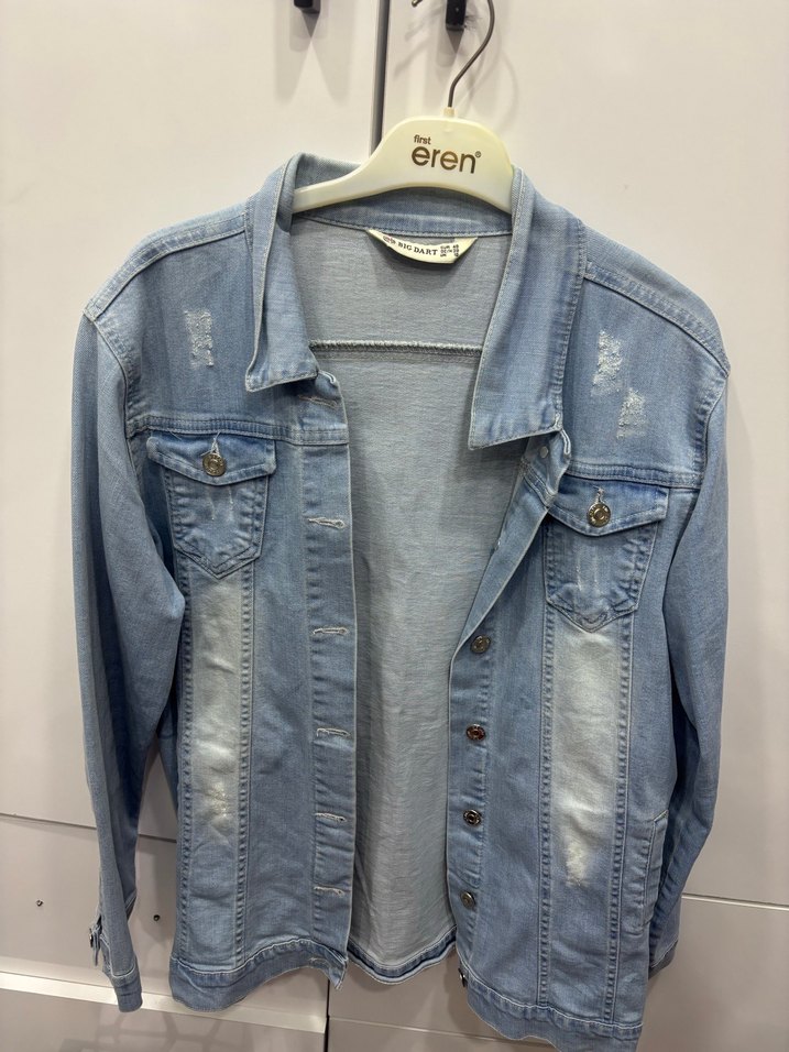 Düğmeli, uzun kollu, normal uzunlukta ve bol kesim mavi kot ceket. Notlu yaka tasarımıyla gündelik rahat stil için uygundur.