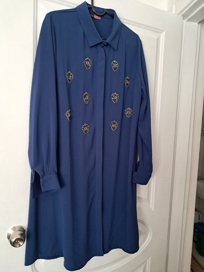 Uzun kollu, düğmeli ve işlemeli detaylara sahip mavi tunik. Rahat kesimi ve satenimsi dokusuyla ofis için uygun bir parça.