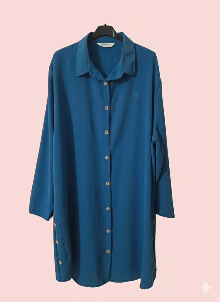 Düğmeli, uzun kollu, mavi kadın tunik. Notlu yaka ve bol kesimiyle, yumuşak sentetik kumaştan üretilmiştir. Günlük sokak stiline uygundur. gömlek bir iki kez giyildi herhangi bir sorunu yoktur.