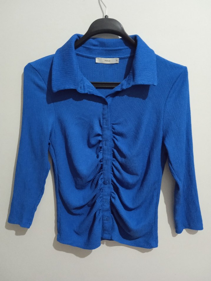 Düğmeli, uzun kollu, yakalı ve keten kumaştan yapılmış mavi gömlek. Parlak görünümlü, ön kısmı büzgülü, günlük ve ofis kullanımı için uygundur.
