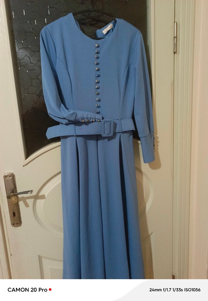 Düğmeli, uzun kollu, mavi uzun elbise. Notlu yaka ve kemer detayına sahip, klasik ve modern tarzda, günlük kullanıma uygun.