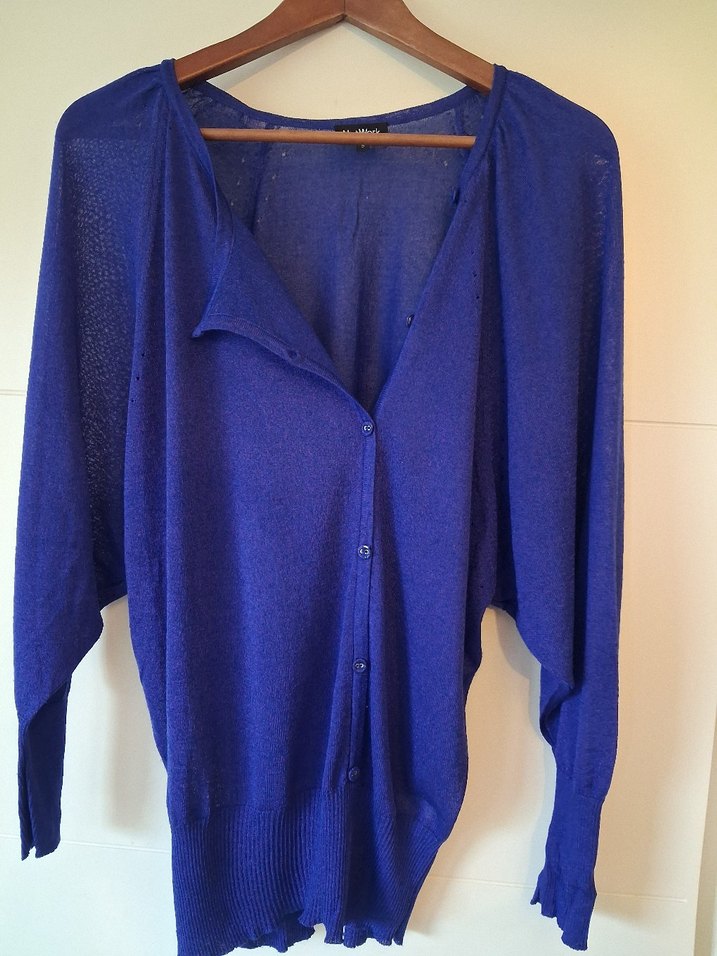 Kadınlar için parlak mavi renkte, düğmeli, bol kesim ve uzun kollu keten hırka. Normal midi boyda ve V yaka, günlük rahat kullanıma uygundur.