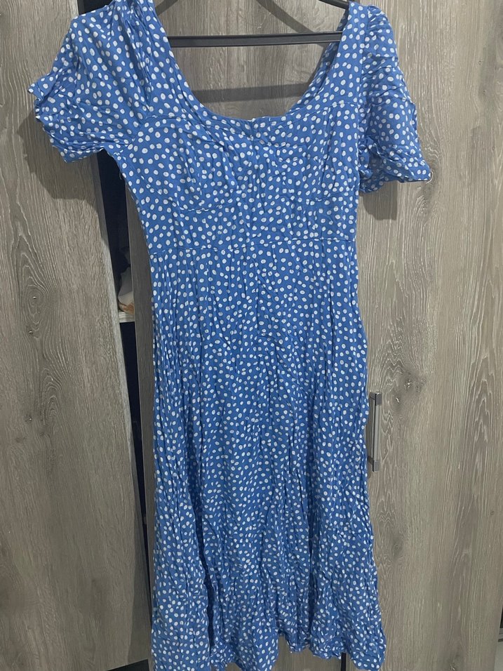 Düğmeli, V yaka ve kısa kollu mavi midi elbise, casual tie-dye deseniyle günlük sokak stili için uygundur. Hiç giyilmedi