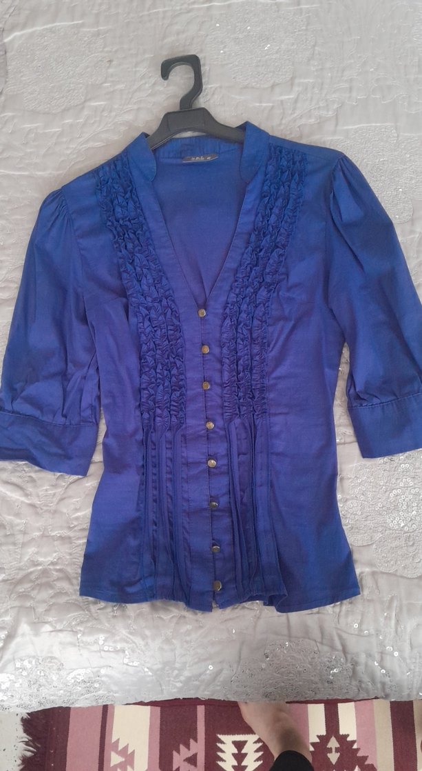 Düğmeli, parlak mavi keten kumaştan, V yakalı ve uzun kollu vintage bohem tarzda, ofis için uygun dar kesim kadın gömlek.M-L uyumlu takas düşünürüm