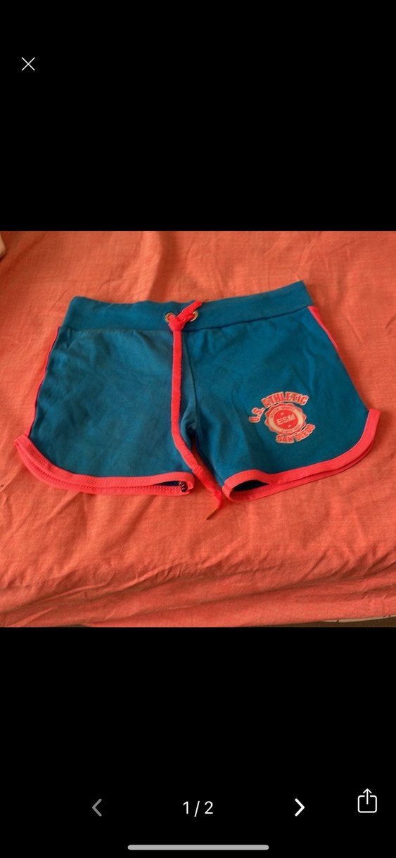 Düğmeli ve bağcıklı beli olan, pembe detaylı mavi, baskılı, pamuklu kız şortu. Trendy ve rahat bir tarz sunar.