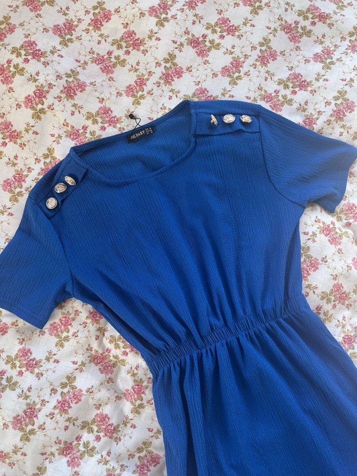 Hiç kullanılmadı etiketi mevcut değil Mavi vintage bluzu, kısa kollu ve düğmeli omuz detaylıdır. Rahat kesimli, belden büzgülü ve yumuşak keten kumaştandır, günlük kullanıma uygundur.