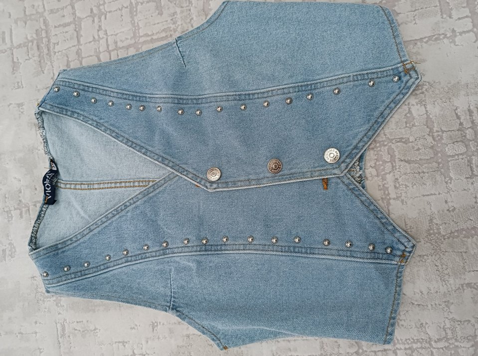 Düğmeli, mavi renkli, vintage biker tarzında, fitted kesim ve çıtçıtlı yaka detaylı kolsuz denim yelek. Parlak yüzeye sahip, günlük kullanıma uygun.