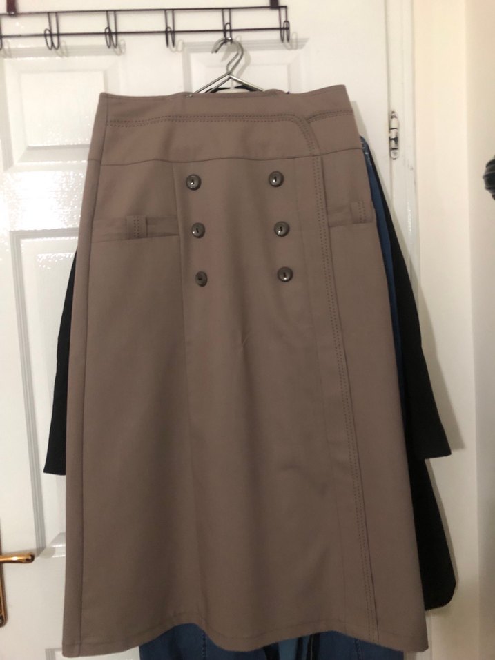 Düğmeli ön kısmı ve regular kesimi olan bej midi etek, yumuşak kumaştan yapılmıştır. Paris tarzı, normcore stil ile ofis kullanımı için uygundur Boy/92