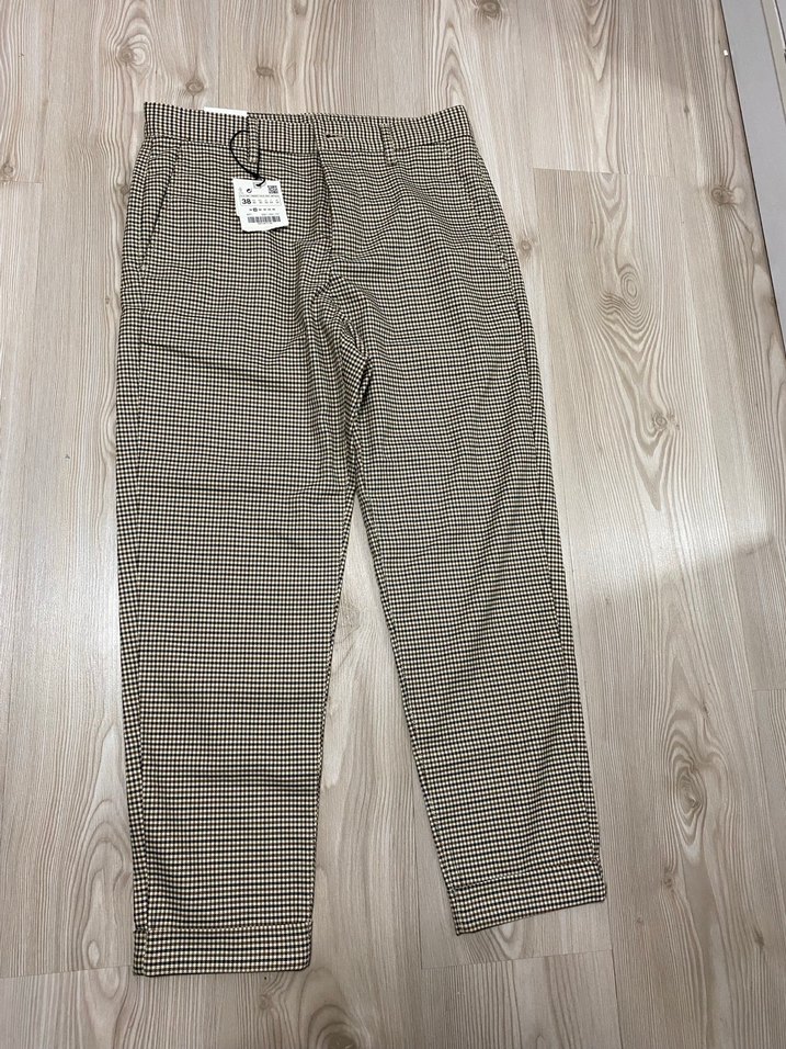 Düğmeli, midi boy, bej renkli Unisex kumaş pantolon. Sentetik kumaştan, baskılı desene sahip, günlük rahat kullanıma uygun.