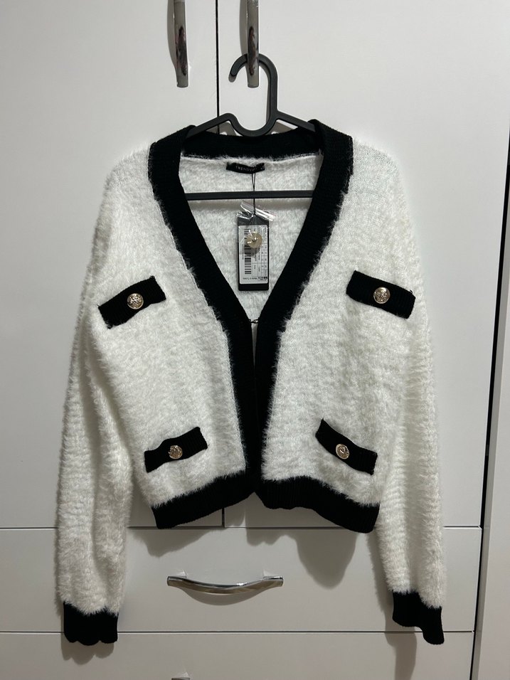 Düğmeli cep detaylı, siyah şeritli beyaz örme hırka. Uzun kollu, normal boyda, salaş kesim ve notched lapel yakalıdır.