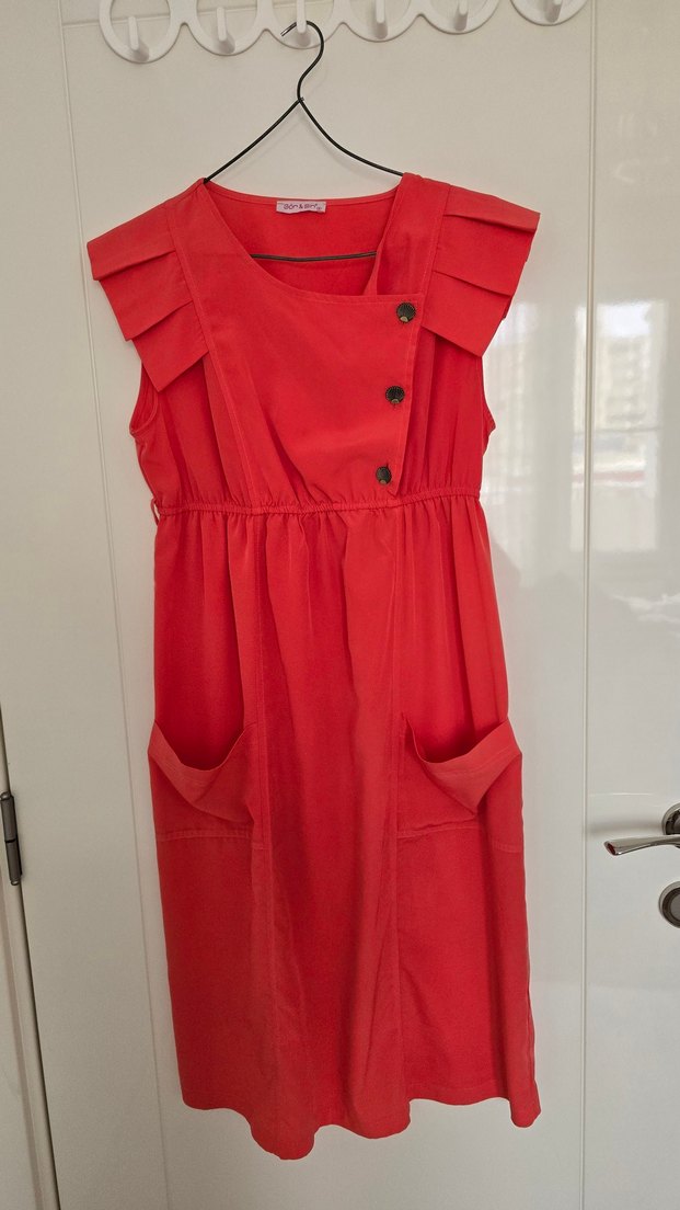 Renkli nar çiçeği midi elbise, düğme detaylı, straplez yaka ve bol kesime sahip. Yumuşak sentetik kumaştan, cepli ve bohem tarzda, günlük kullanıma uygun.