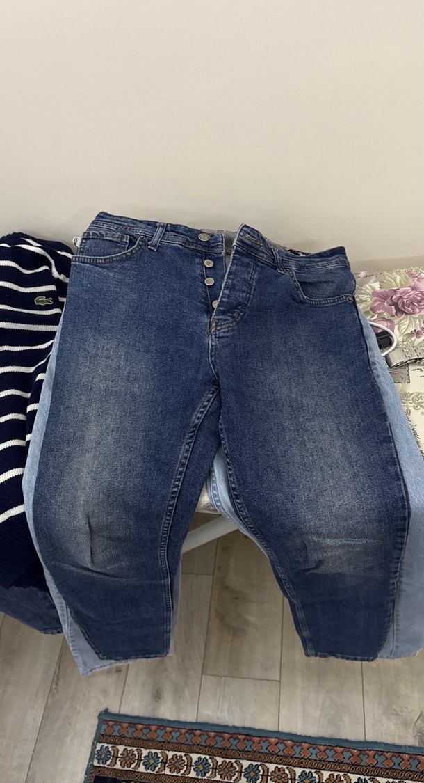 Düğmeli, gevşek kesim, midi boy mavi kot pantolon. Günlük kullanıma uygun, rahat normcore tarzda kadın kotu.