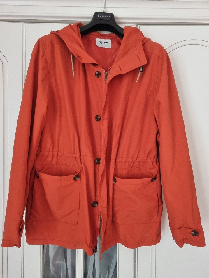 Düğmeli, uzun kollu ve bol kesimli midi boy erkek ceket. Notlu yaka, turuncu renk ve büyük ceplerle minimalist sokak stili. Kapüşonlu ve rahat kullanımlı.