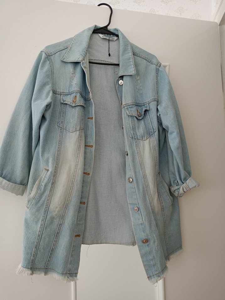 Düğmeli ön kısmı ve notlu yaka detaylı, bol kesim kadın midi boy kot ceket. Yırtmaç detaylı bir sıkıntısı yok