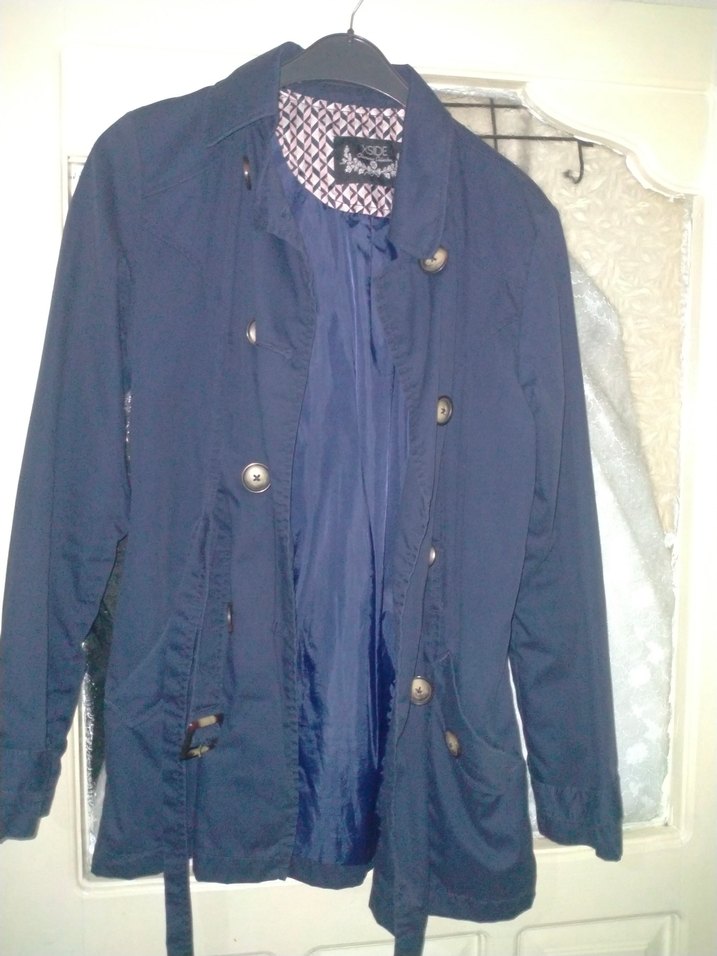 mavi renkte, düğmeli ve notalı yaka detaylı midi boy ceketi. Bol kesim, uzun kollu ve günlük rahat sokak stili için uygun.