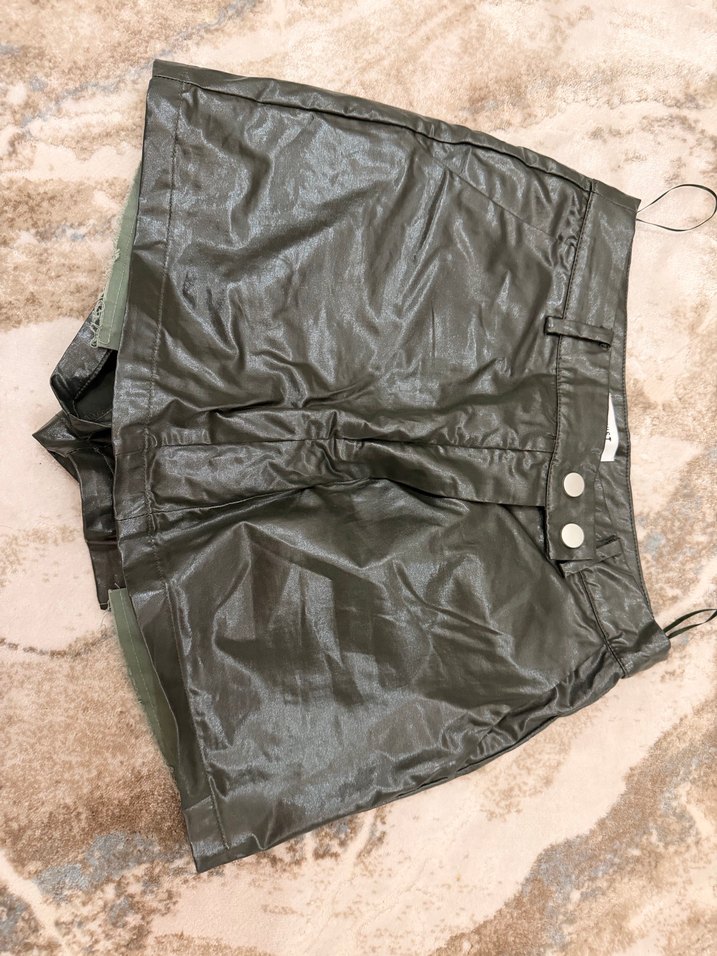 Koyu kahverengi, düğmeli detaylı, midi boyda, bol kesim deri kadın şort. Sokak stiline uygun, grunge punk tarzıyla dış mekan kullanımı için ideal.